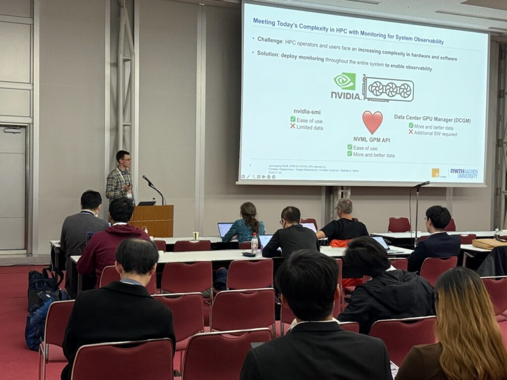 Christian Wassermann presented his new research paper „Leveraging NVML GPM for NVIDIA GPU Monitoring“. With the rise of machine learning workloads, GPUs have become one of the most important components of today’s HPC systems. To ensure their efficient utilization, monitoring enables observability of user applications at the system scale. The work supports these efforts by providing a light-weight, open-source monitoring tool that leverages the NVML GPM API. Try it yourself! The group highlight the utility of the collectable data in three use cases for evaluating the performance of GPU kernel executions, modeling the GPU energy consumption of workloads, and analyzing the overall cluster workload. They include a validation of the available metrics and propose a post-processing methodology to increase the value of the NVML GPM data for application-level insights.