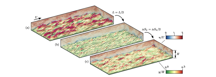 Additional simulations featuring wider domains were simulated in this project period, including sensitivity analyses, and the variation of different canopy properties. An illustration is given in figure 2. Characteristics of flow and canopy motion were extracted by means of time averages, including Reynolds stresses. Quadrant analyses give access to sweep and ejection events which are linked to low- and high-speed velocity streaks.